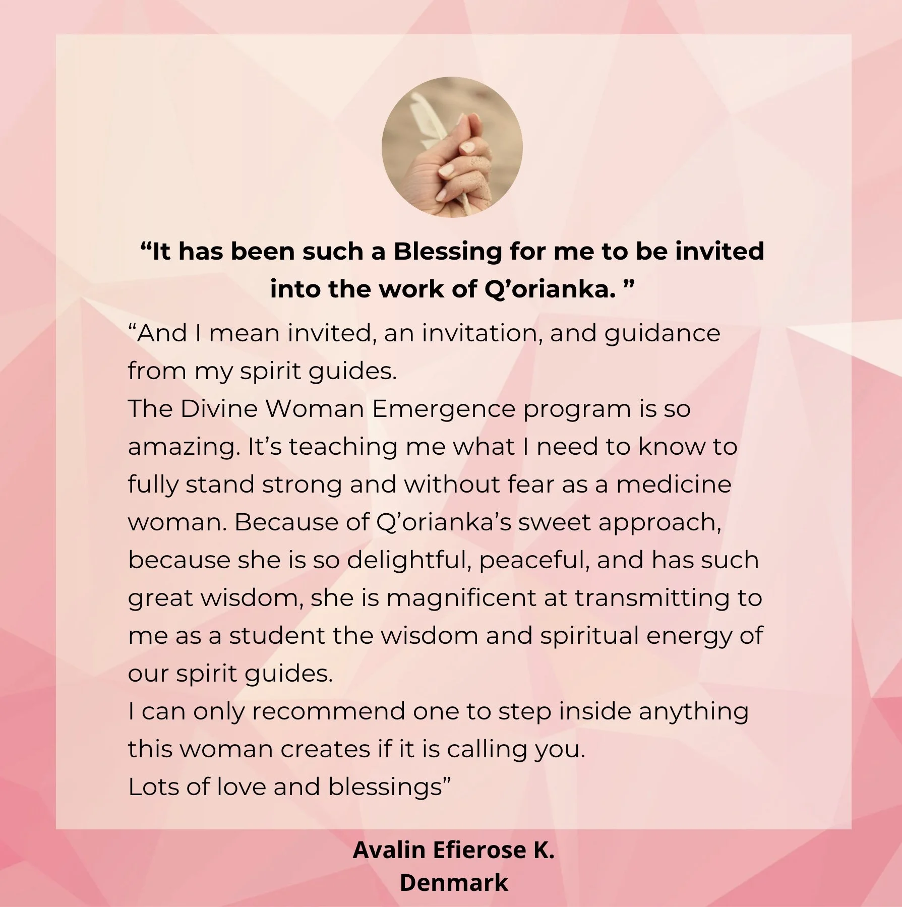 The Divine Woman Emergence is an essential initiatory program for the Medicine Woman that helps transform struggle, lack of self-trust, and procrastination into ease, confidence and timely growth in your spiritual path and sacred service.